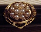 Gold Filigree Ring, 10 Seed Pearls on one side and Tigers Eye in a gold Bezel on the other. Flips over so you can wear a different look each time.