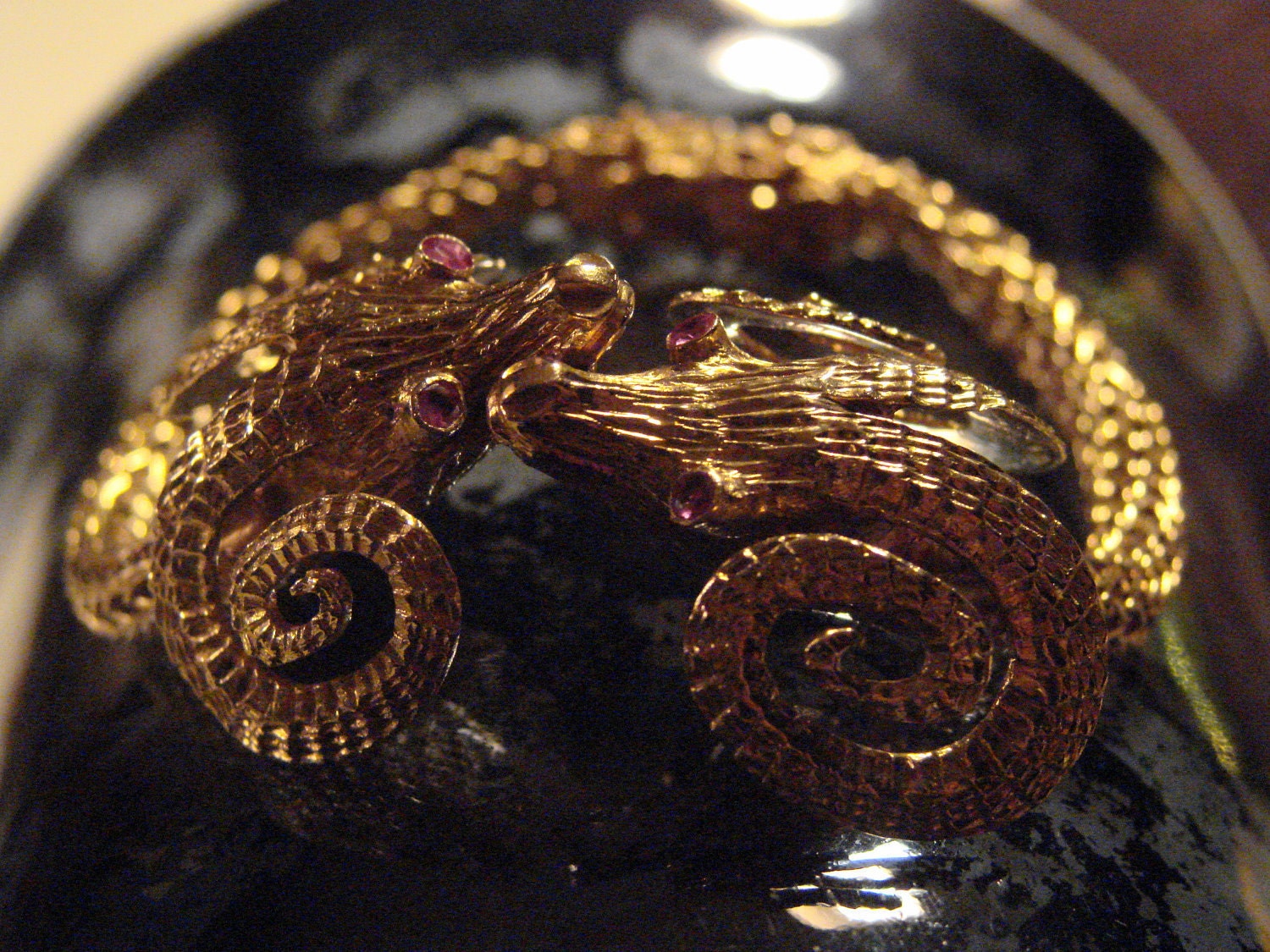 This is an incredible piece. Its a double Aries Rams head Bracelet, Cuff is flexible woven 18K Gold, All 4 Eyes are Ruby. It has a detailed and pretty clasp. This is a unique Bracelet. Very Beautiful