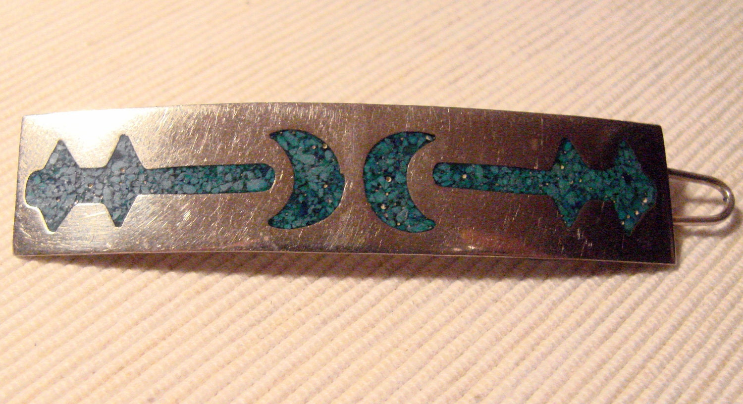 Alpaca Silver with Inlaid Turquoise Barrett or Scarf Pin. It can be multi wearable I believe, Looks like it can be a barrette or a scarf or shawl pin.