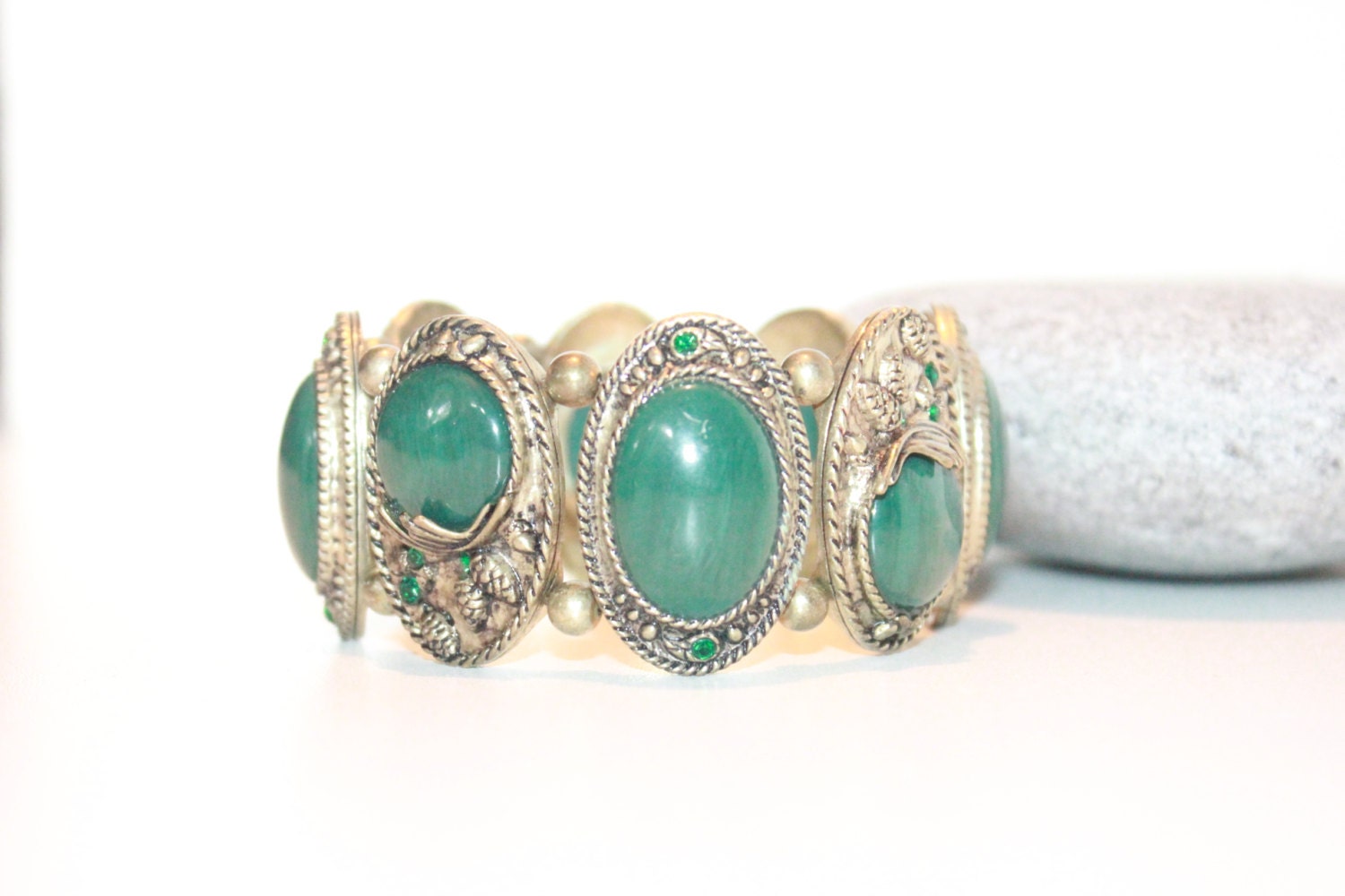 2 Day SALE Vintage Art Nouveau Revival Bracelet / 1960s Green Lucite and Pave Rhinestones / Stretch Bracelet
