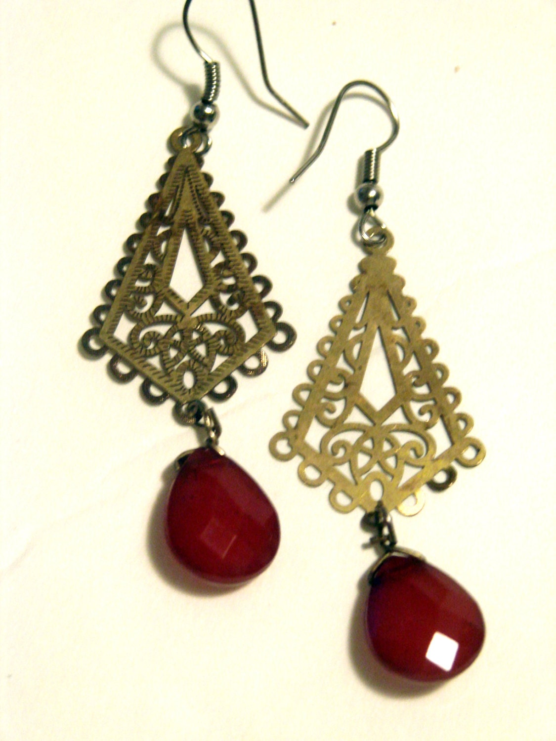 Vintage Bohemian Dangle Earrings Bronze Filigree and Red Gemstone
