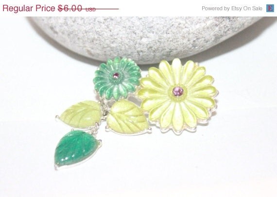 LIMITED TIME SALE Womens Brooches / Vintage Silver Colored Metal / Green Lucite and Rhinestone Dangle Brooch