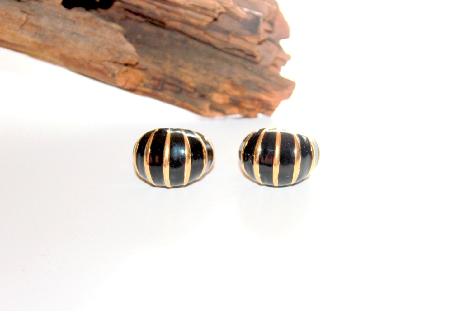 Vintage 80s Nina Ricci Solid Hoop Earrings Black and Gold Clip On