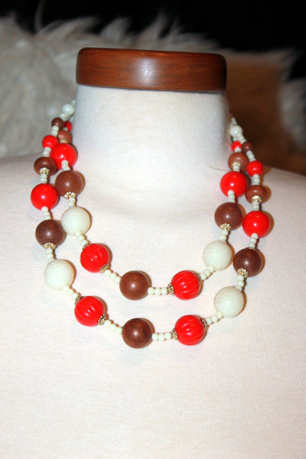 Vintage 19'' Mid Century Carved Lucite and Wood Beaded Necklace Red White and Brown