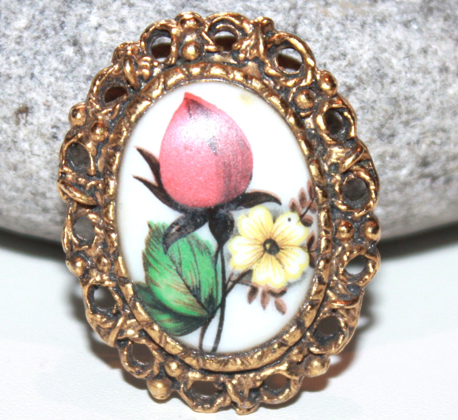 Mid Century Milk Glass Brooch / Framed Painted Floral Glass Brooch / Womens VIntage